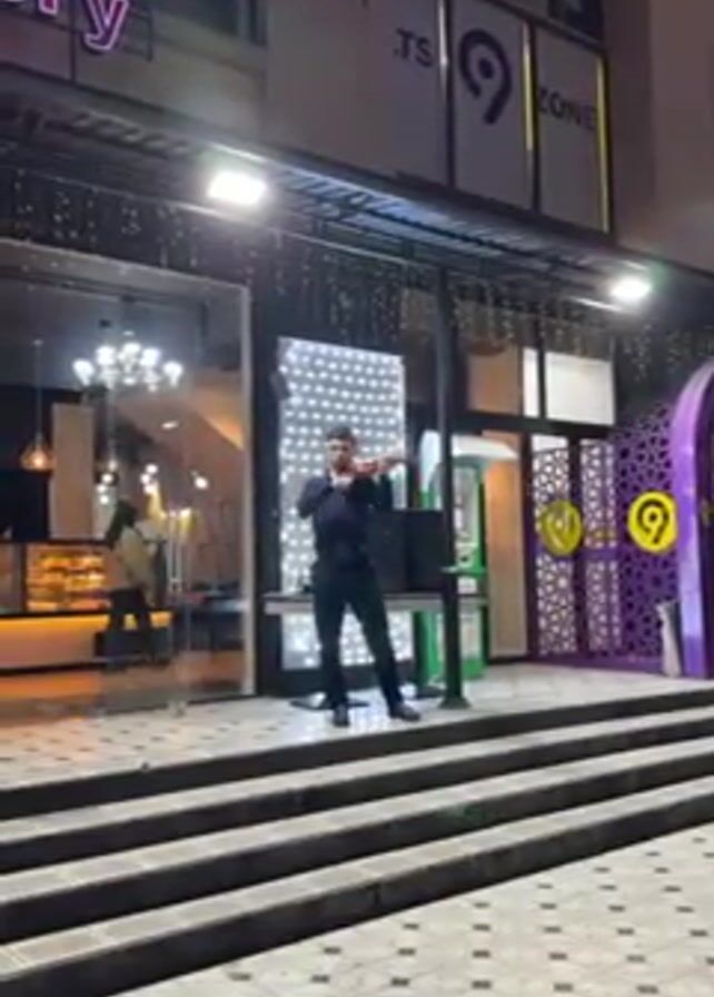 A man is playing the violin on a staircase in front of a building at night. He is dressed in a black shirt and black pants. Behind him are bright lights and a table. To his left is a bakery, and to his right is a brightly lit sign that says "9 ZONE." The steps leading to the building are covered in a repeating tile pattern. A woman walks past the bakery. The sign above the man reads ".TS" above "9 ZONE".