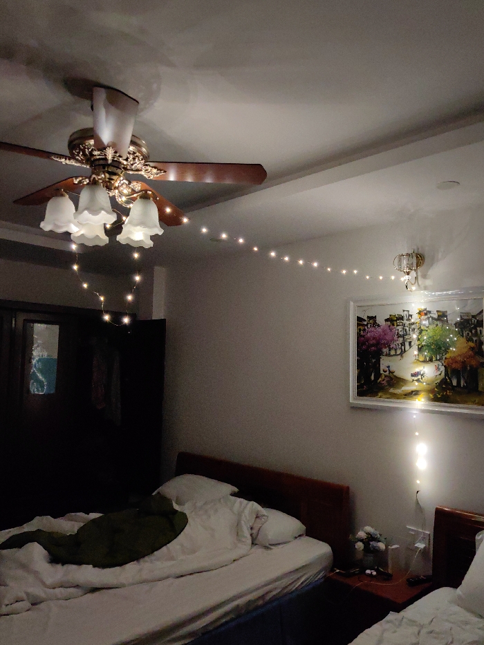 A dimly lit bedroom features two twin beds. One bed has a green sleeping bag on top of rumpled white sheets and pillows. String lights hang from the ornate ceiling fan, across the ceiling, and down the wall next to a framed painting of a colorful townscape. A wall sconce is above the painting. A dark wardrobe is visible in the corner. A nightstand sits between the beds.