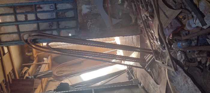This image captures the interior of a cluttered workshop or storage area in Nairobi, Kenya. Several tall, arch-shaped metal frames, likely unfinished door or window components, stand vertically in the midground and foreground. To the right, a multi-paned window with a distinct blue frame is partially visible, with some panes appearing opaque or covered. The floor is covered in a dense accumulation of debris, including various metal scraps, a clear plastic water bottle with a blue cap, and other discarded materials. A bright light source, likely sunlight, emanates from an opening or doorway in the background, creating a strong backlight effect and illuminating dust particles in the air. This light source also silhouettes additional vertical structures further into the background, possibly more frames or wooden planks. The walls of the space are rough-textured, showing signs of wear and discoloration, including white paint drips. No individuals are present, and no actions or interactions are depicted within the static scene.