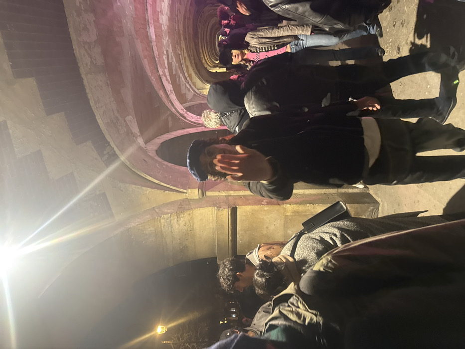 A group of people stands inside a stone tunnel or archway with pink and yellow accents