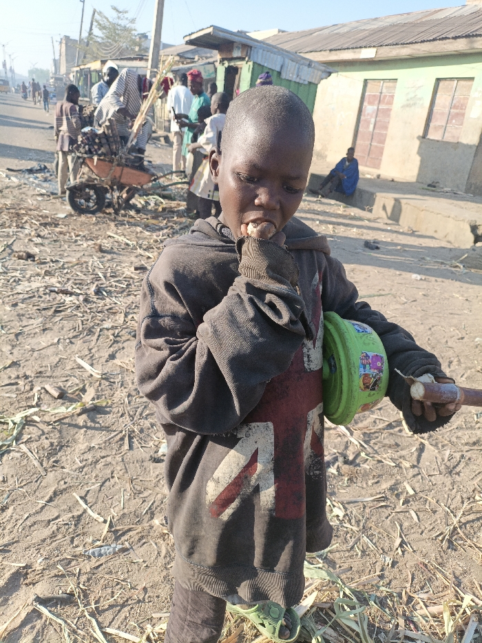 A young, thin boy with short hair eats sugarcane. He wears a worn, dark-colored sweatshirt with a faded Union Jack design and carries a green plastic toy. In the background, several people are gathered near a cart loaded with sugarcane stalks, some appearing to be vendors. The ground is littered with sugarcane remnants. Dilapidated buildings with faded paint stand along the street, where another person is sitting.
