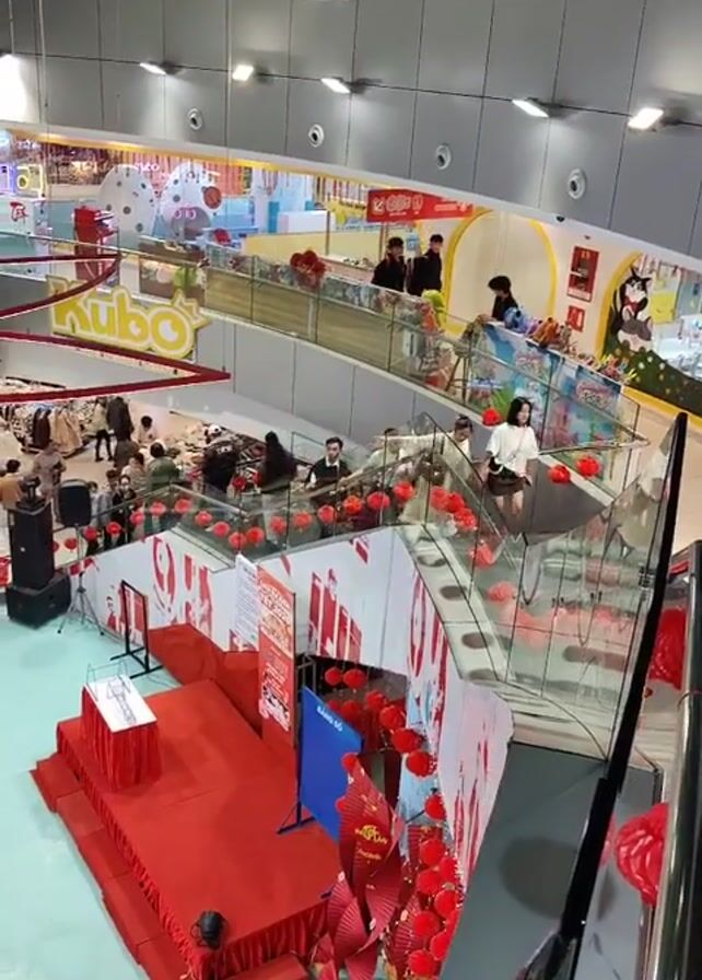 interior of a shopping mall, looking down from a higher level. The mall features a multi-level layout with different zones. The upper level includes "Kubo" and other retail or entertainment spaces. The middle level shows a seating area. Decorations of red lanterns, flowers, and banners are present. The ground floor has a stage with red carpets and a small table. There's also a "META GAME" zone, food stalls, tables, and people seated around them. People are walking around, standing, and seated. Escalators are visible. A sound system is set up near the stage. The video appears to be taken from an elevated position, possibly a mezzanine or another level of the shopping mall.