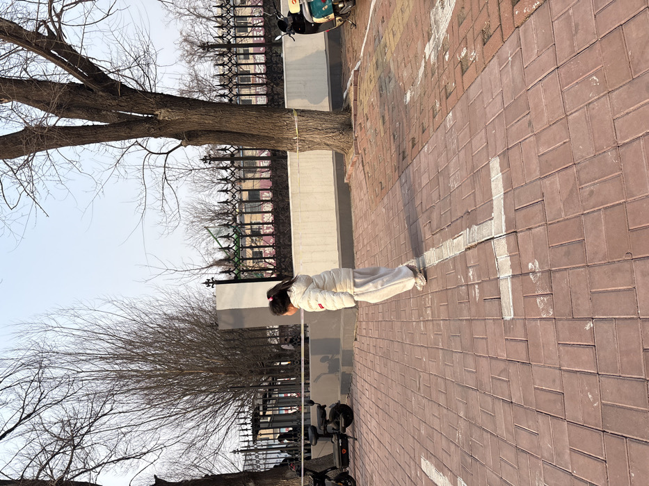 This image depicts an outdoor urban scene in the city of Linghe, China, during daylight hours, likely in late autumn or winter. A young child, viewed from behind, is the central subject. The child wears a white hooded puffer jacket, light-colored loose-fitting pants, and light-colored shoes, with dark hair tied in a ponytail. The child is positioned towards the center-right of the frame, facing left, appearing to be walking or standing on a surface paved with reddish-brown interlocking bricks laid in a herringbone pattern. White painted lines, forming a partial 'T' shape, are present on the brick ground in the foreground. In the mid-ground, a dark, ornate metal fence with pointed finials extends horizontally across the frame. Behind this fence, a light-colored wall or building structure is visible. To the immediate left of the child, a black electric scooter is parked. To the right, a large bare deciduous tree stands, its trunk secured by a yellow or white strap, with a teal and white scooter partially visible behind it. Numerous other bare deciduous trees populate the background against a clear, light blue sky. Faint silhouettes of other individuals are discernible behind the fence on the far left.