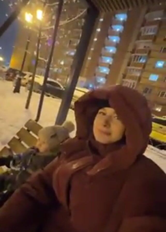 A woman and a child sit on a swing bench in the snow. The woman is wearing a large, hooded, maroon-colored puffer jacket, and the child is bundled in a gray coat and a knitted hat. The bench swings gently. Behind them, a multi-story building is visible at night, with many illuminated windows. A street lamp shines nearby, casting a warm glow on the snowy ground.
