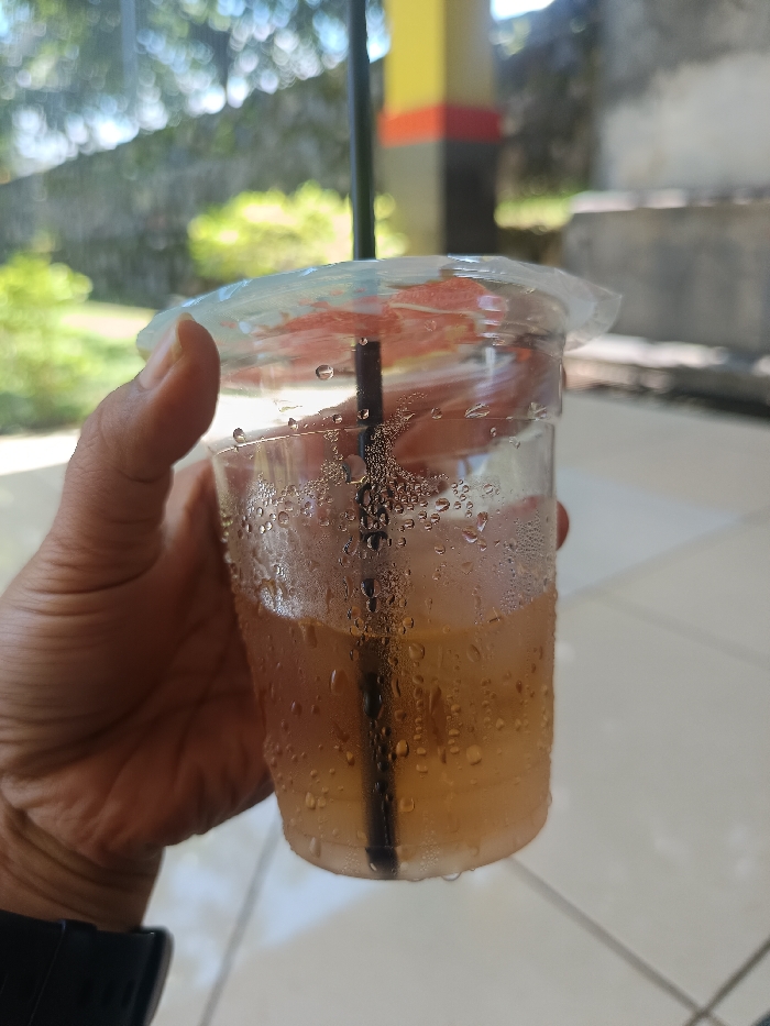 A hand holds a plastic cup filled with a light amber liquid, presumably a beverage. The cup is sealed with plastic wrap and has a black straw inside. Condensation covers the outer surface of the cup. The background features greenery and blurred structures, suggesting an outdoor or semi-outdoor setting. The hand and the cup are the primary focus of the image.