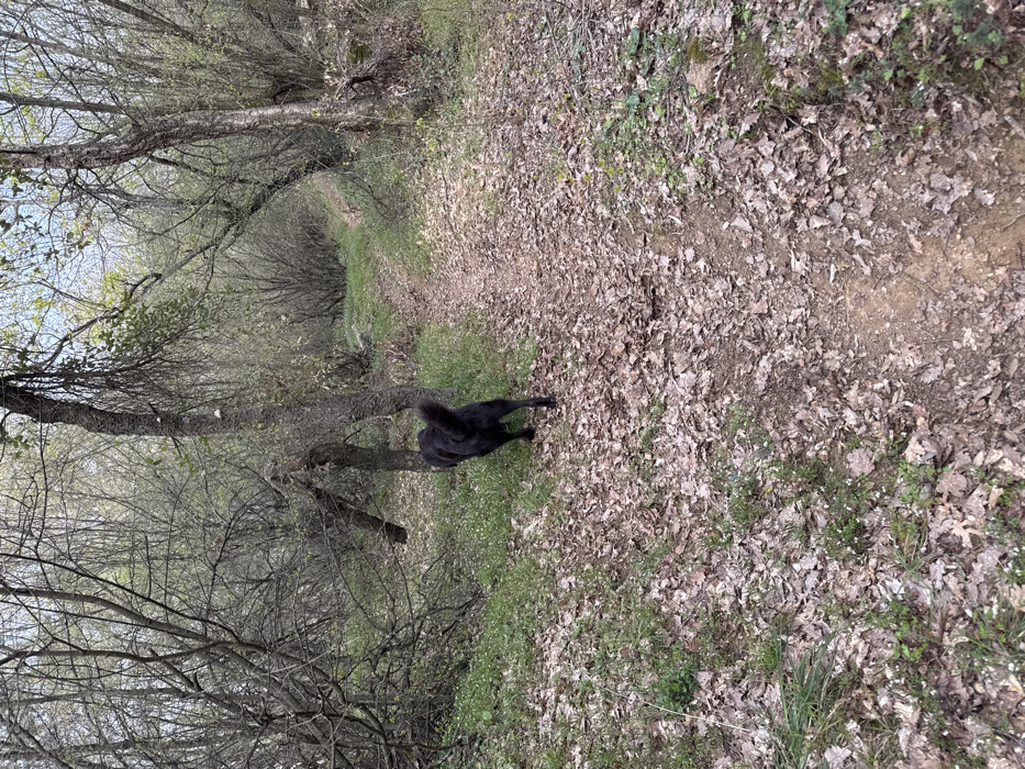 The scene depicts a woodland path in Razhdak, Bulgaria. A medium-to-large black dog is observed walking away from the camera, moving along a narrow dirt path that extends into the distance. The path and adjacent ground are extensively covered with dry, brown deciduous leaves. Dense trees and shrubbery line both sides of the path, displaying nascent light green foliage, suggesting early spring. Patches of green grass with small white flowers are visible on the ground off the path. A tree trunk positioned to the left of the dog features two small, light-colored circular markings. No other individuals or animals are present.