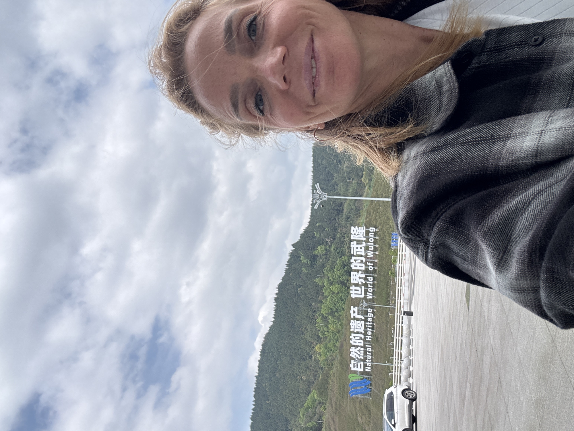 A woman poses for a selfie in Wulong District, China. She is fair-skinned with blonde hair and wearing a plaid shirt. Behind her, a sign in Chinese and English reads "Natural Heritage World of Wulong". A mountain range is visible behind the sign, and a cloudy sky fills the upper part of the frame. A white vehicle is parked in the lower right corner. The ground appears to be paved.