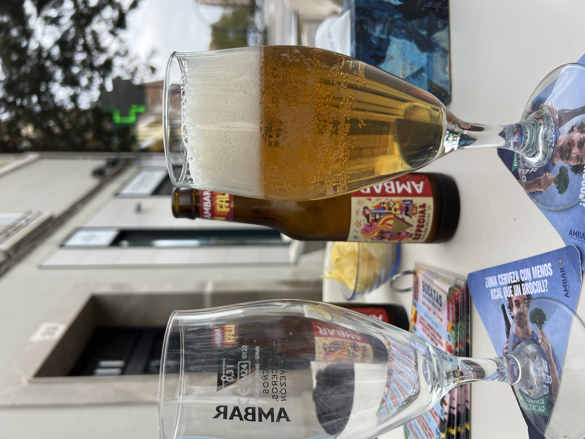 The image depicts an outdoor café table on a street in Valencia, Spain. In the foreground, an empty Ambar-branded beer glass stands to the left, marked with "0,3l CE M24 0122 VICRILA 48940-SPAIN". To its right, a second Ambar beer glass is approximately half-filled with golden, carbonated beer and topped with a foamy head. Both glasses rest on blue Ambar coasters featuring an advertisement slogan in Spanish. Behind the empty glass, a stack of laminated menus, including one for "BOCATAS," is visible. Between the two glasses and further back, an open brown glass bottle of Ambar Especial Fallas beer is present, along with a small glass bowl containing potato chips. A second Ambar beer bottle is partially obscured behind the empty glass. To the right, a blue patterned tissue dispenser is visible. The background shows a light-colored building facade with a dark doorway marked with the number "39". Further right, a blurred green cross sign, characteristic of a pharmacy, is visible above scattered tree foliage. The sky appears overcast, suggesting daytime. The specific location is on a street at building number 39 in Valencia, Spain, proximate to a pharmacy.