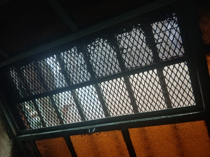 The scene depicts an interior view looking outwards through a secured window located in Ongata Rongai ward, Kenya. The foreground is dark, framing a vertical window structure composed of dark-colored metal. To the left, a section of orange-amber, textured glass with an irregular, possibly pebbled or hammered pattern, occupies approximately one-third of the window's width. The central and right portions of the window are fitted with two panels of dark, diamond-patterned expanded metal mesh, serving as security grates. The upper mesh panel exhibits multiple rectangular cutouts or sections with a denser or different mesh pattern. Bright light from an exterior source penetrates through the security grates, illuminating the diamond pattern and creating significant contrast with the darker interior elements. No individuals are visible. No specific actions or interactions are depicted. The environment visible through the grates is indistinct due to the mesh and lighting, showing only diffused lighter areas suggesting an exterior space.