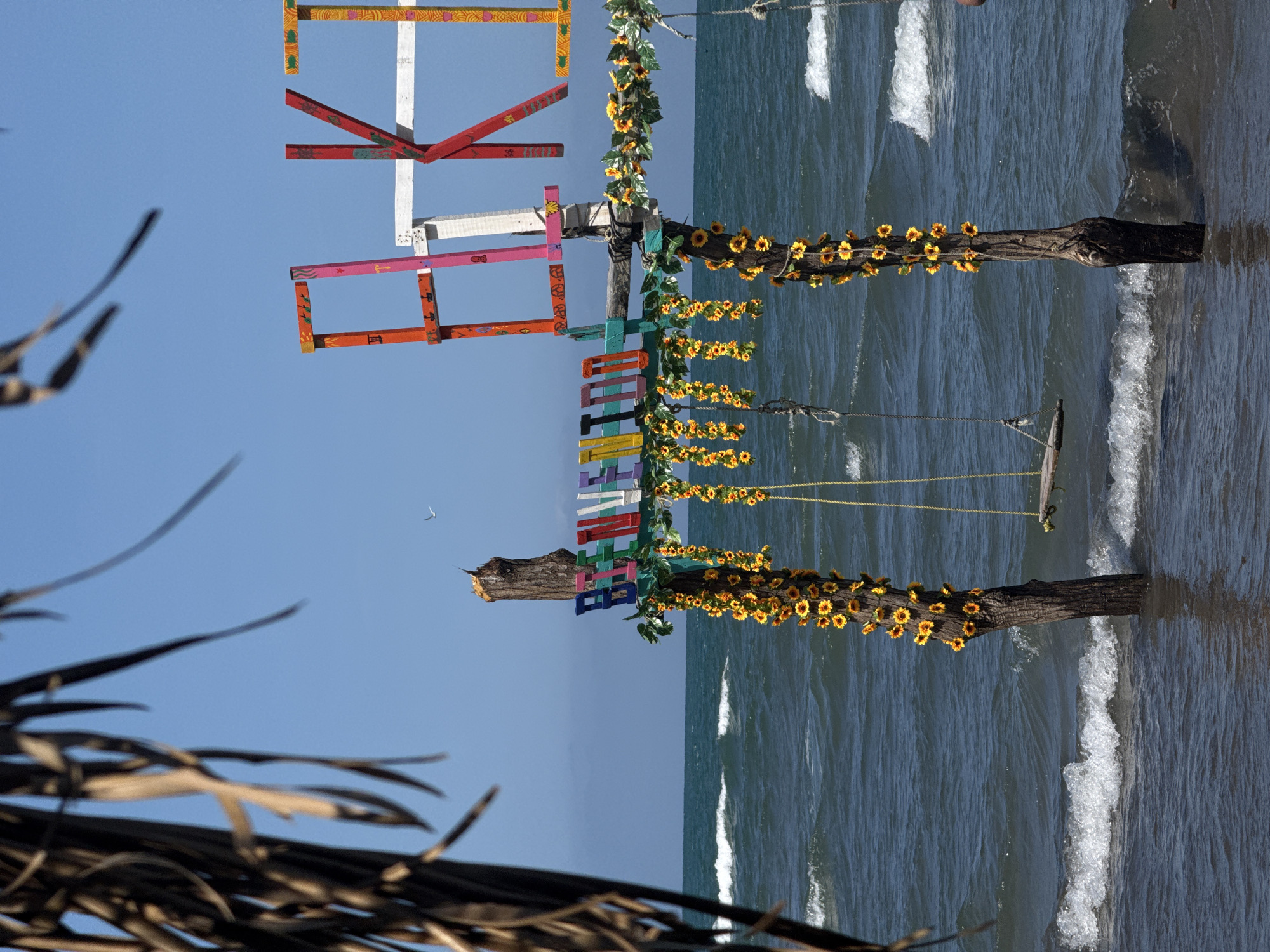 beach scene at Mata de Uva, Mexico. A swing set is constructed from two driftwood logs decorated with artificial sunflowers and greenery. A colorful, decorative sign is attached to the logs. The swing hangs over the beach, where gentle waves break on the shore. A clear blue sky is visible, and palm fronds are in the foreground.