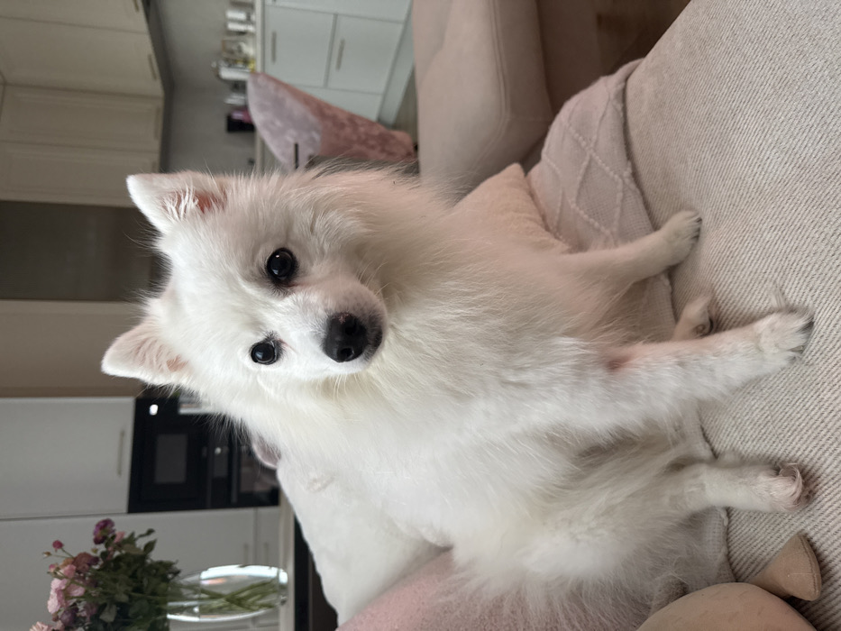 - "A small, white, fluffy dog, consistent with a Pomeranian or Japanese Spitz breed, is seated upright on a light-colored fabric sofa" by FM-GBY8N2, licensed under CC BY 4.0