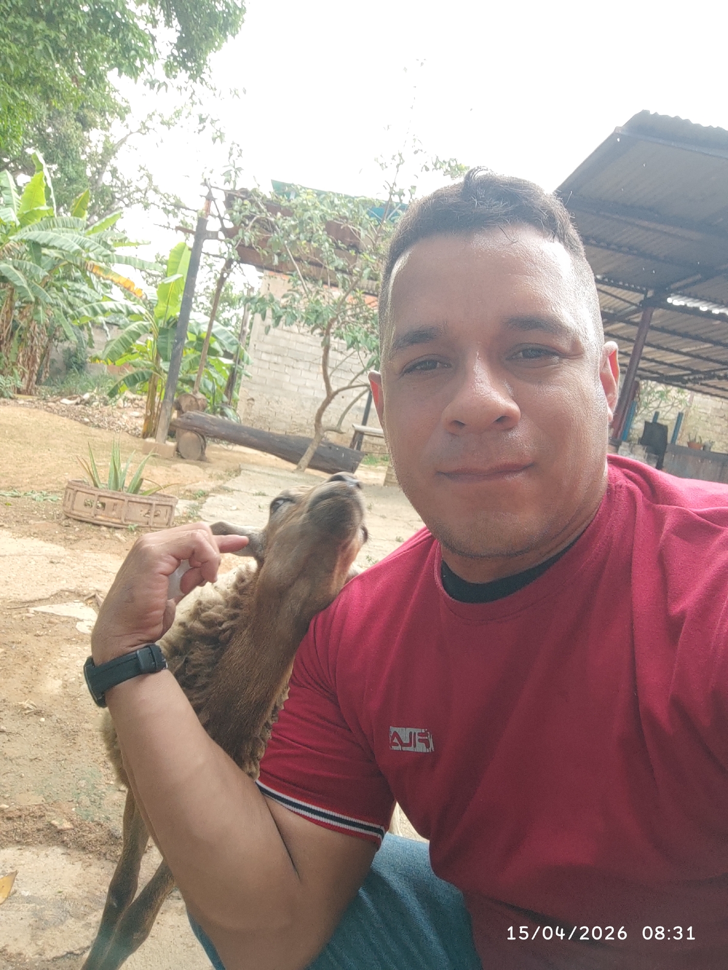 A man is holding a young camel and taking a selfie outdoors. The man is wearing a red t-shirt with a logo on the left side and a black watch on his left wrist. He has short hair and a neutral expression. The camel is brown and looks up toward the man's face. The setting appears to be in a rural or semi-rural area with trees, vegetation, and a building structure in the background. The image includes a timestamp indicating a date of April 15, 2026, at 08:31. The environment looks like a farm or backyard. This image was taken in Tinaquillo, Venezuela.