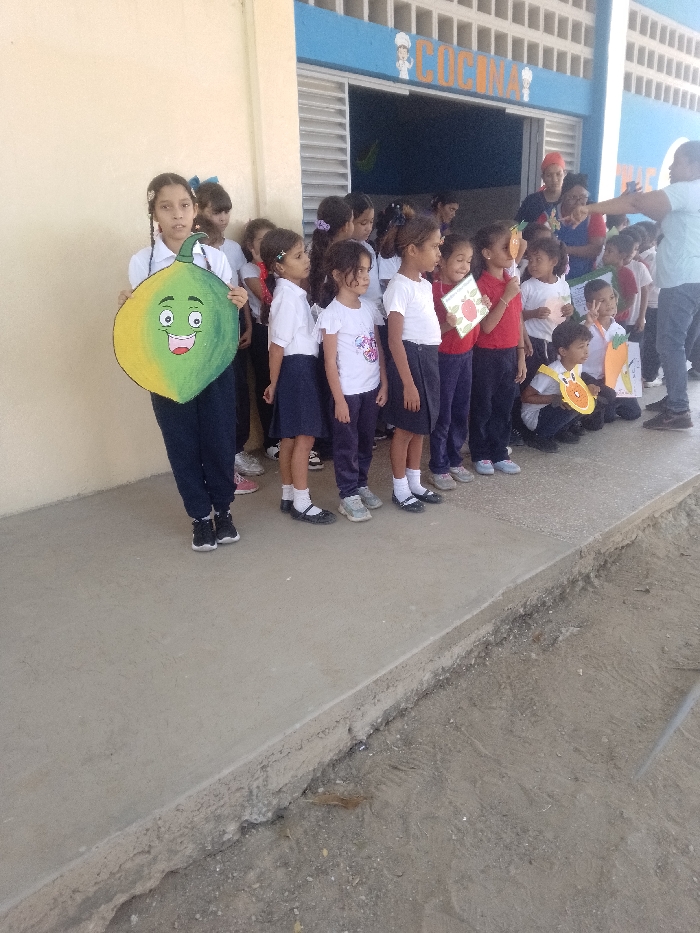 An outdoor scene in La Tagua, Venezuela, displays approximately 15-20 children, primarily girls, aged 5-10 years, gathered on a concrete elevated walkway. They are positioned in front of a building with a light-colored wall on the left and a blue upper facade above an entrance. The entrance is marked with the white text "COCINA" (Kitchen) and a white chef's hat logo. Many children wear white short-sleeved shirts with dark skirts or pants, consistent with school uniforms, while others are in casual attire. Several children are holding large, illustrative cardboard cutouts of fruits and vegetables. A girl on the far left holds a two-tone green and yellow smiling fruit cutout. Further along the line, another girl holds a red apple cutout, and a kneeling child on the right holds a round, orange fruit cutout. An adult male, wearing a light-colored t-shirt and dark pants, stands on the far right, facing the children and gesturing with his hands. Other adults are partially visible in the background, behind and to the right of the children. The concrete walkway meets an uneven dirt ground level in the foreground. The scene is illuminated by natural daylight.