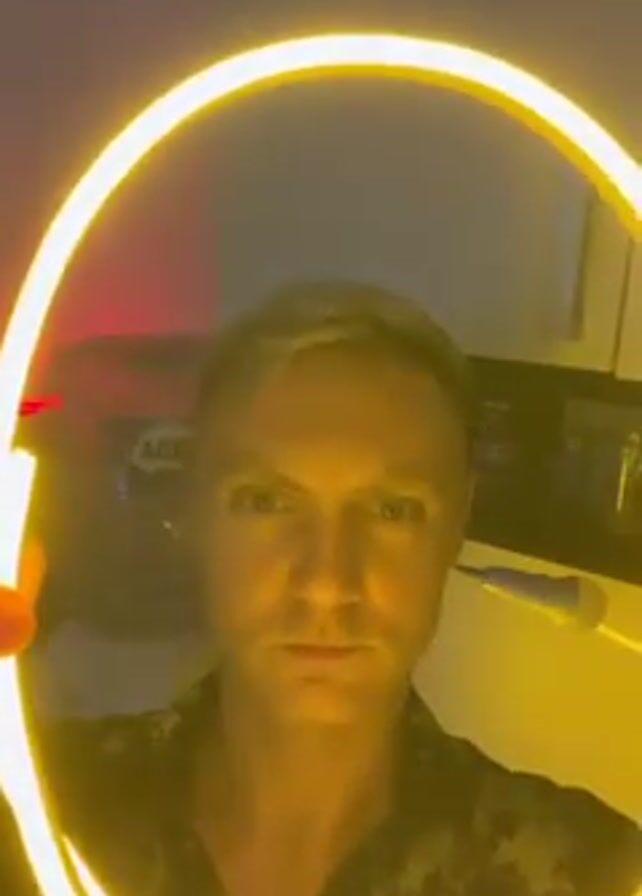 A man holds a yellow circular light in front of his face. The man has short, light-colored hair and blue eyes. He is wearing a patterned shirt. The background is blurry, but it appears to be an indoor space with other lights visible. He initially has a neutral expression, then briefly smiles.