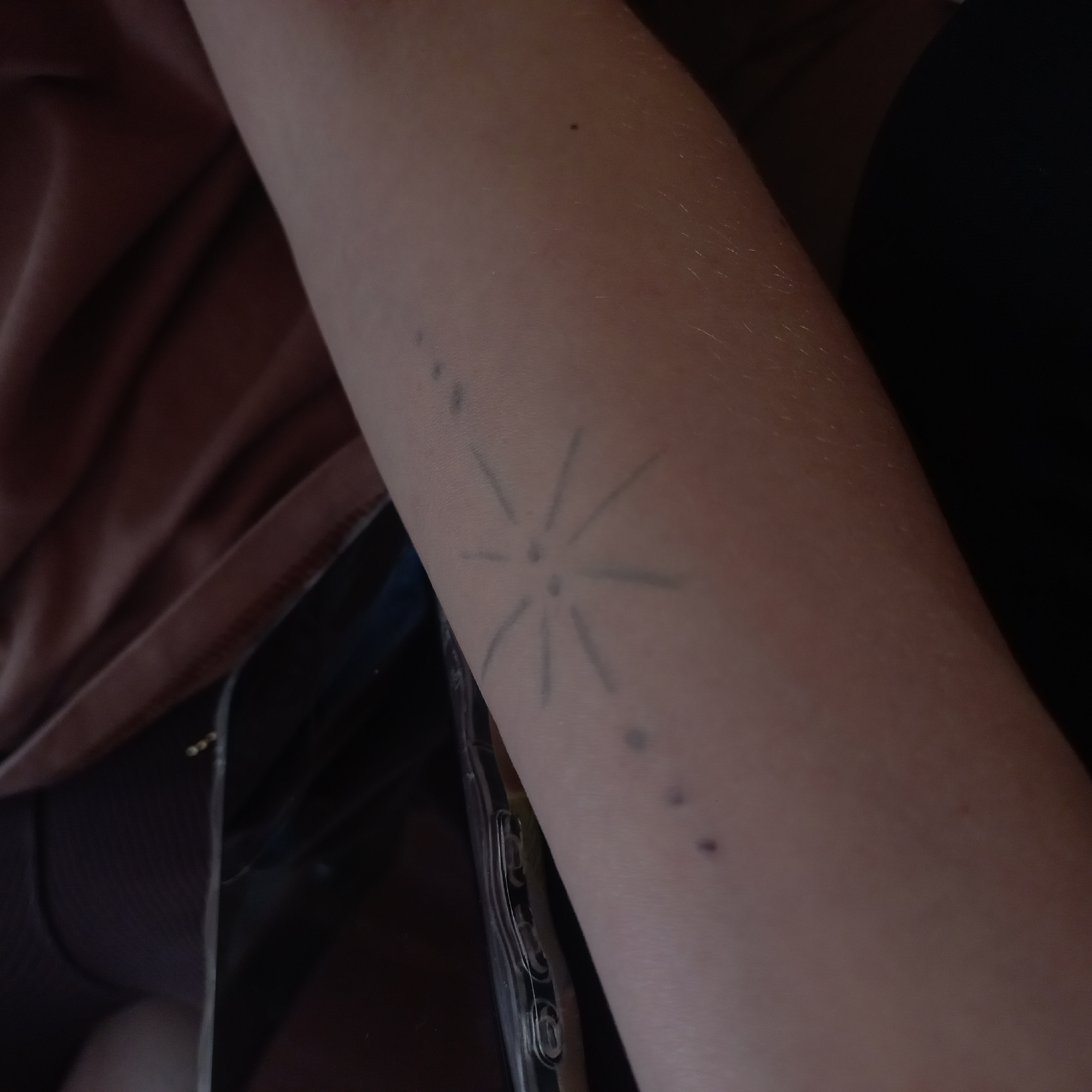 The scene is located in Kurganinsk, Russia. The image displays a human forearm, positioned diagonally across the frame from lower right to upper left. The skin tone is light to medium, exhibiting fine hair and several small, dark epidermal spots. Centrally located on the visible portion of the forearm is a faded, dark grey marking resembling a simplistic starburst, consisting of a central dot with eight radiating lines of varying lengths. Additional smaller, irregular dark dots are scattered in proximity to this marking and further up the arm. To the left of the forearm, a dark-screened smartphone in a clear protective case is partially visible, with its side buttons discernible. The background consists of dark brown or maroon fabric with visible folds in the upper left, and a dark, indeterminate fabric (likely black) in the lower section. No specific actions or interactions are depicted.