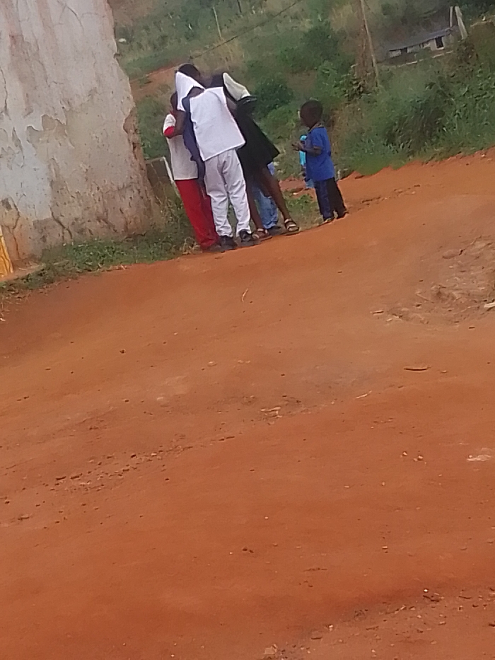 The scene appears to be a dirt road near a building with a weathered exterior, possibly in Ukwu-Abwa, Nigeria, given the context. A group of individuals is gathered near the building. One child, dressed in blue, stands apart from the group. The group includes individuals wearing red pants, white clothing, and dark clothing. The interaction between the group is unclear, as their body language suggests a huddle. The environment includes greenery in the background and a dirt road in the foreground.