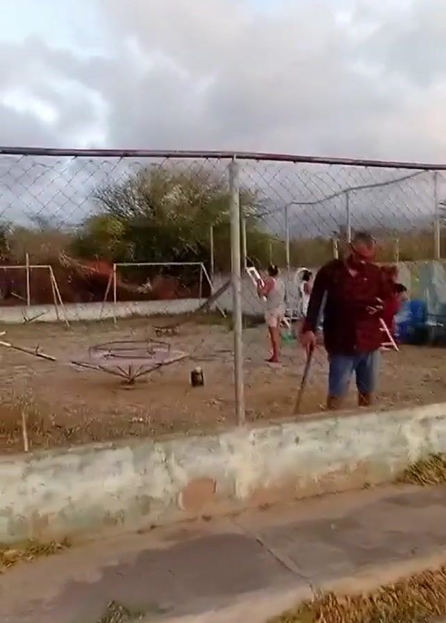 man walking with a cane inside a fenced area that appears to be a partially constructed or under-renovation playground. Other people are visible inside the fence, engaging in activities such as sweeping and sitting in chairs. The playground contains various pieces of equipment, including what seems to be a swing set frame and other unidentified structures, all surrounded by a dirt ground. A concrete wall runs along the edge of the fenced area, and the sky is overcast. The camera appears to be moving slightly, suggesting it is being held by someone walking along the outside of the fence.