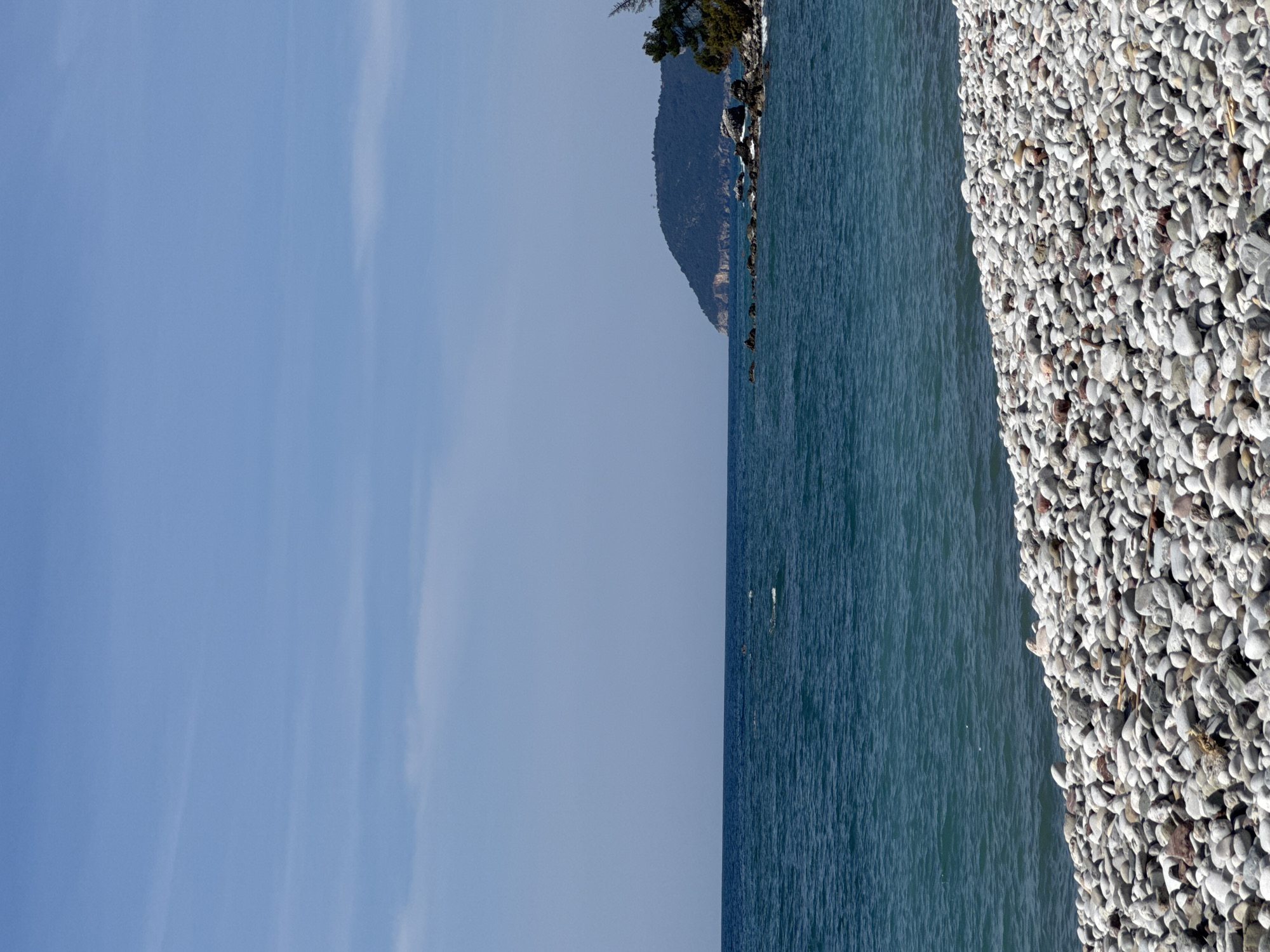 The image displays a coastal scene in Bar, Montenegro, under a clear light blue sky with faint, wispy cloud formations. The foreground is occupied by a pebble beach composed of numerous smooth, ovoid stones, predominantly light grey and white, interspersed with some reddish-brown and darker grey pebbles. The midground features the calm, deep blue-green waters of the Adriatic Sea, exhibiting slight surface ripples. Within the water, approximately three indistinct dark shapes are visible, consistent with human figures partially submerged and potentially swimming or floating. To the far right, a rocky shoreline emerges from the water, sparsely covered with dark green vegetation, possibly pines. In the background, a prominent, forested hill or small mountain rises from the sea on the left-center. The hill's summit contains faint outlines of what appear to be two small, vertical structures.