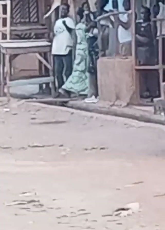 A man on a motorcycle drives away from the camera. Behind him, a group of about 6 people stand in front of a building. Subsequently, a woman wearing a white top and a blue and brown patterned skirt walks away from the camera. The scene takes place outdoors on what looks like a dusty road or street.