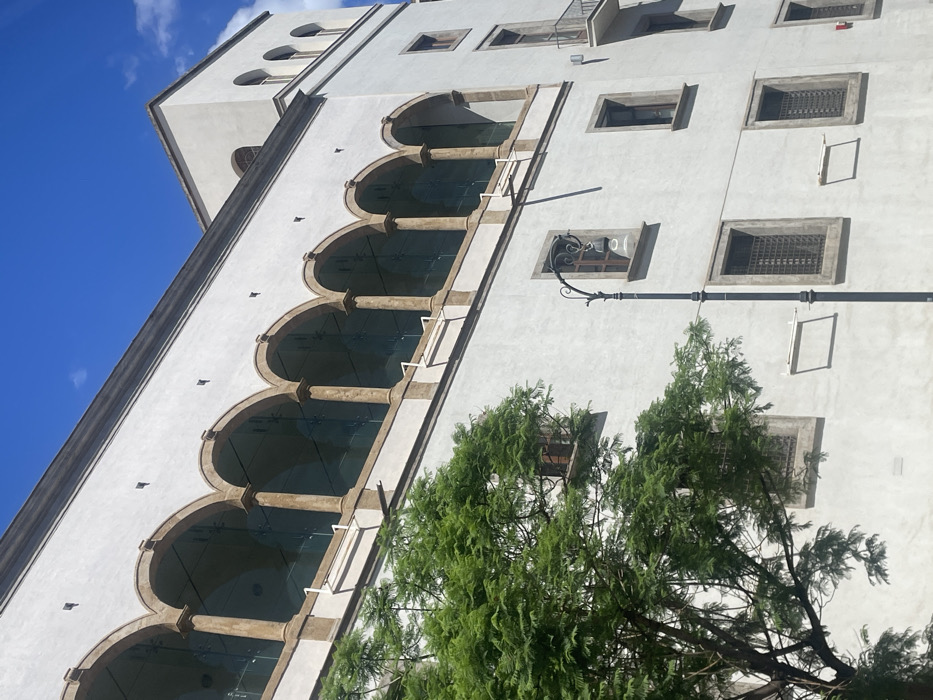 The image displays the Palazzo Branciforte located on Via Bara all'Olivella in Palermo, Italy, under bright daylight conditions with a clear blue sky. The prominent, multi-story building features a light-colored (white or cream) facade. Its upper level is dominated by an arcaded loggia composed of seven visible arches, each supported by darker-toned stone columns or pilasters. These arches are glazed, enclosing the loggia space. To the right, a taller section of the building rises, featuring additional arched windows and a flat roofline. Below the loggia, the building's lower levels contain multiple rectangular windows with dark frames and internal security grates. Several small, square indentations are present on the facade beneath some windows. A small, modern-style balcony with a metal railing is visible on the far right. In the lower left and central foreground, a large green tree with fine, dense foliage partially obscures the building. A black, ornate streetlamp with a clear, bell-shaped light fixture stands upright in the mid-ground, casting a long shadow across the facade. No individuals or discernible actions are present in the scene.
