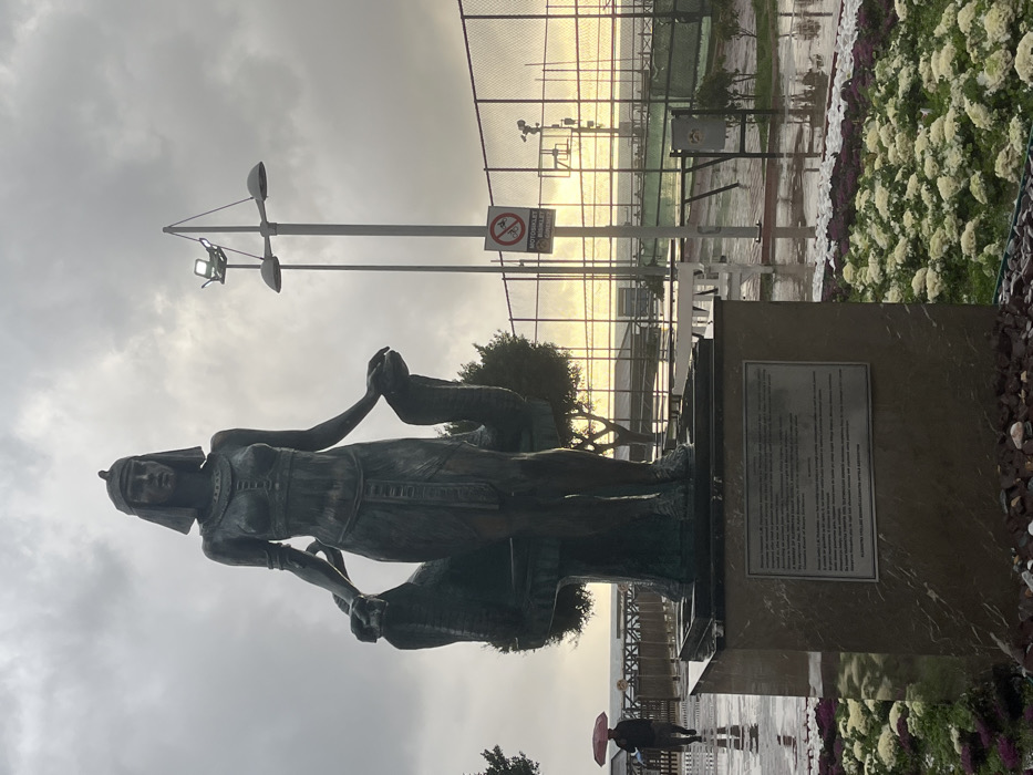 An exterior medium shot captures the "Cleopatra" statue in Alanya, Turkey, on an overcast day with a visibly wet ground surface