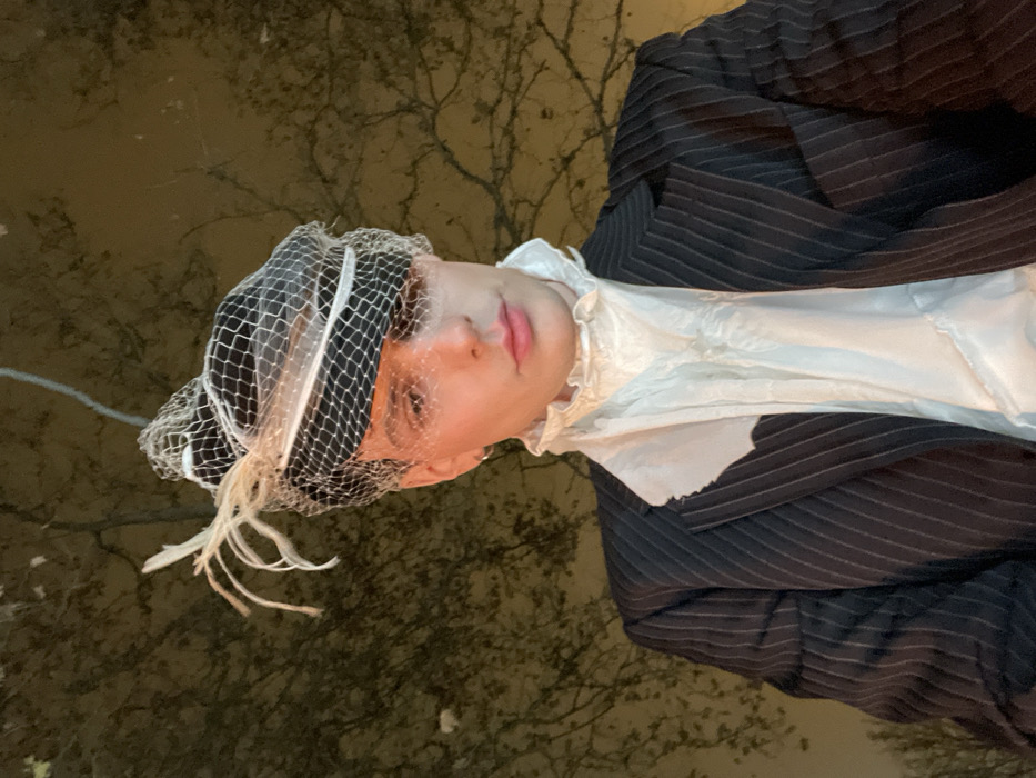 A person wearing a black pinstripe blazer over a white ruffled shirt and a vintage hat with netting and feather accents. The person is facing forward, looking towards the camera with a neutral expression. The background is an indistinct outdoor scene at night with a dark sky, possibly trees. The image is oriented vertically, and the person is slightly angled.