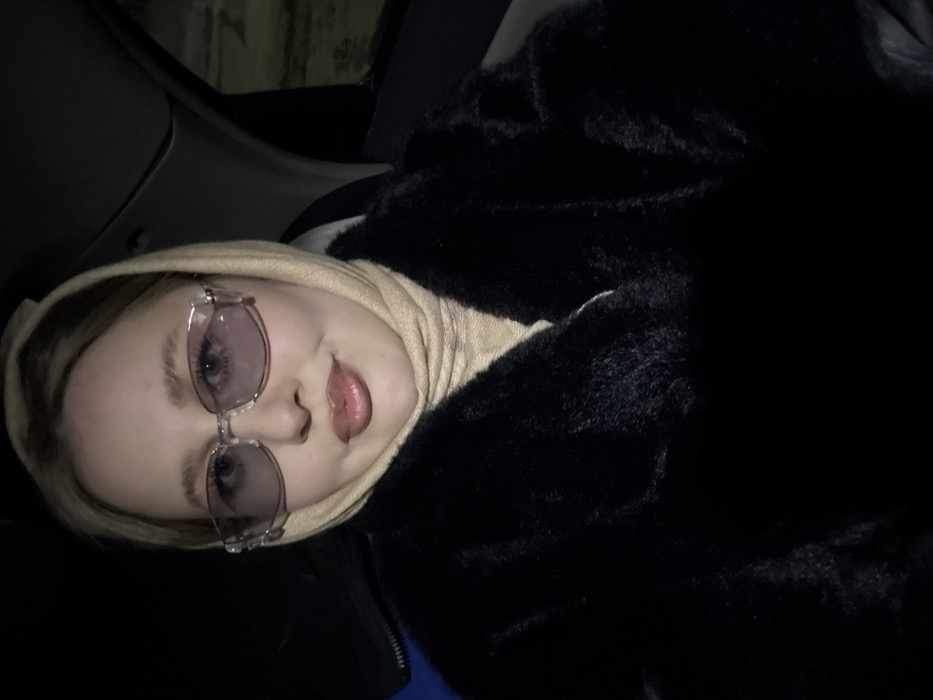 A female individual is centrally framed in a medium close-up, seated within a vehicle interior. She has light-colored hair partially visible beneath a beige headscarf that covers her head and neck. She wears light-tinted, oval-framed sunglasses with clear frames and a black, plush, possibly faux fur coat with a wide collar. Her lips are full and coated with a glossy, light pink or nude lipstick. The background is dark, revealing details consistent with a car's ceiling and a side window reflecting minimal exterior light, indicating a nighttime or low-light environment. A blue fabric element, possibly part of an outerwear garment or seatbelt mechanism, is visible on the left. The specific city location of Chaikovsky, Russia, is not discernible from the visual information provided.