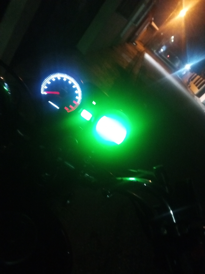 A motorcycle's dashboard is visible at night