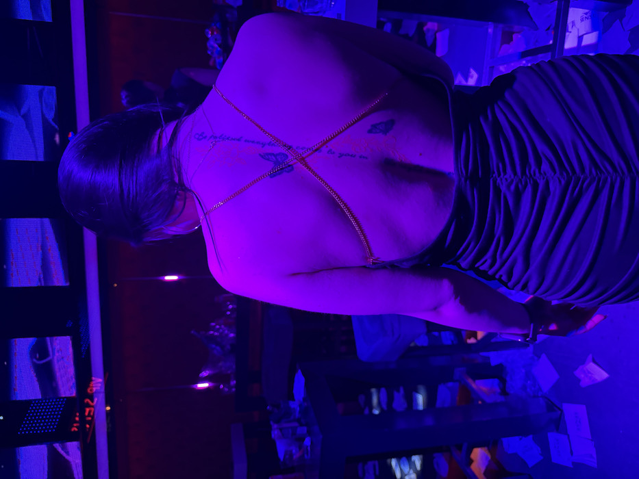A woman is observed from behind, standing in a dimly lit indoor environment characterized by purple and blue illumination. She wears a dark, backless dress with ruching, and a gold-colored body chain is draped across her upper back. Visible on her back are tattoos: text oriented vertically along the spine and two butterfly motifs. A large hoop earring is present on her right ear, and a watch or bracelet is on her left wrist. The background features multiple rectangular screens displaying purple and blue light patterns. Dark, elevated surfaces resembling tables or bars are visible, holding indistinct objects. The floor is strewn with white papers. A blurred figure or reflection is distantly visible behind the woman. The specific location within Vaglarovo, Bulgaria, is not discernible from the image.