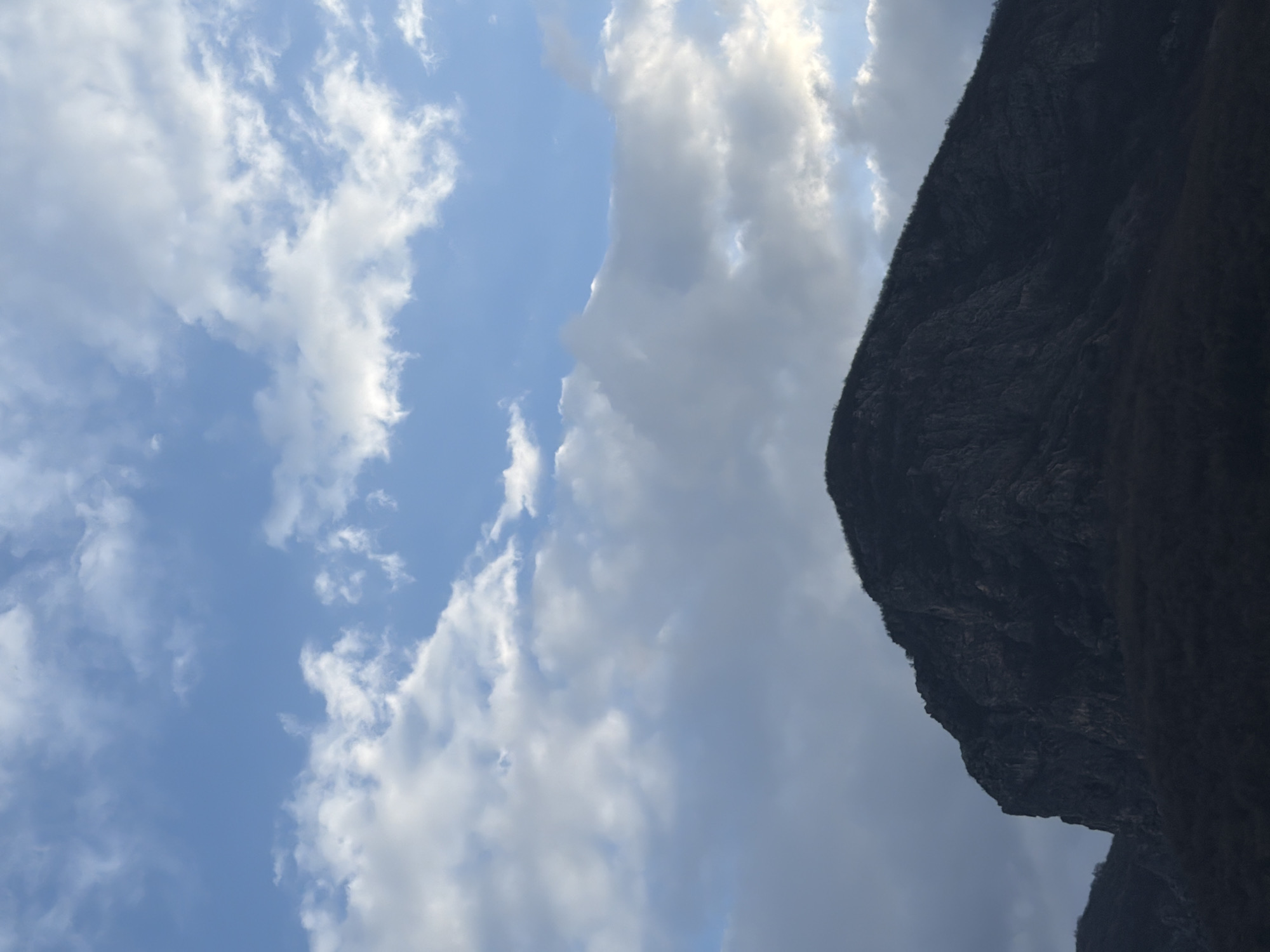 The image displays a landscape dominated by a large, dark mountain peak situated in the Vratsa region of Bulgaria. The mountain occupies the lower approximately two-thirds of the vertical frame, exhibiting a rugged, rocky texture with sparse, dark vegetation visible along its ridges and lower slopes, appearing shadowed or silhouetted. The upper third of the image shows a sky with varied cloud cover. Patches of clear blue sky are interspersed with white and grey stratocumulus clouds; some clouds are brightly illuminated, while others appear darker, suggesting varying light conditions. There are no visible people, animals, or man-made structures. The scene captures a natural mountainous environment under a partly cloudy sky.