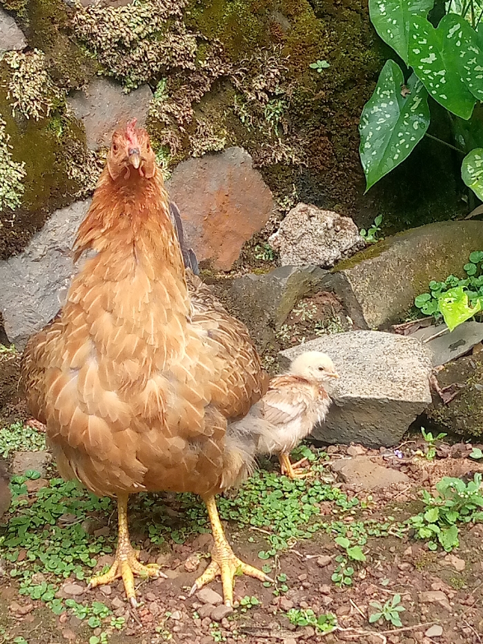 - "In Bafut, Cameroon, an outdoor scene features a reddish-brown hen and a chick" by FM-f6xaq2, licensed under CC BY 4.0