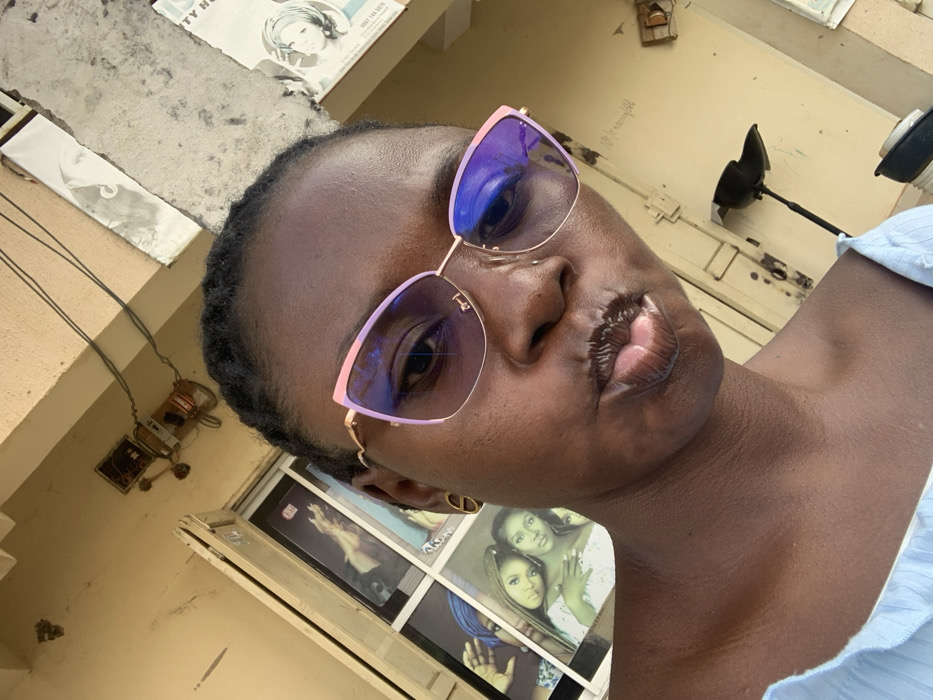 A woman with dark skin and short hair poses, wearing rose-gold framed sunglasses with blue-tinted lenses. Her lips are pursed in a kissing gesture. She is wearing a light blue garment. The background features a concrete structure, an electrical box with wires, a window displaying posters of women, and a black fan. The scene appears to be outdoors.