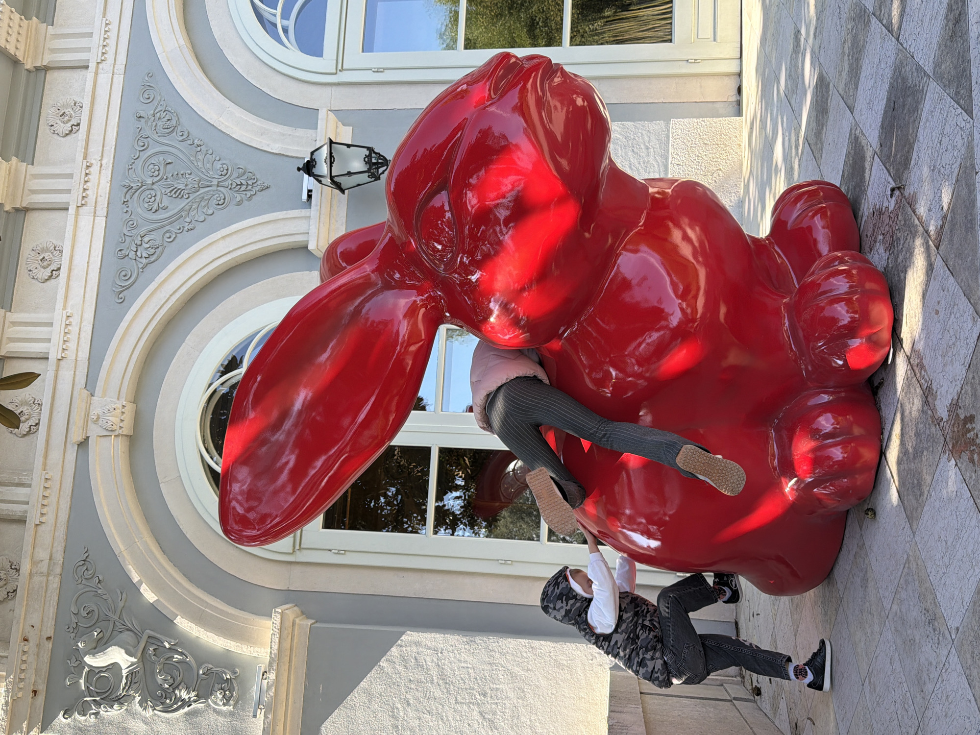 The scene is set outdoors in Grad Opatija, Croatia, in front of an ornate historical building. A large, glossy red rabbit sculpture, approximately 2 meters tall, stands on a light-colored checkered tile pavement. The building behind the sculpture features light blue-grey walls with extensive white architectural detailing, including arched window/door frames, decorative pilasters, and intricate stone carvings. Notable carvings include a rearing horse motif on the upper left wall and symmetrical floral designs above the arches. A black, ornate lantern is mounted on the building's facade between two arches, positioned above the rabbit. Two individuals interact with the sculpture. One adult individual is partially visible, with their lower torso and legs extending from an opening on the rabbit's back. This individual wears a light pink upper garment and dark grey pinstriped pants with a light-colored shoe. A child stands to the immediate left of the rabbit, facing its rear-left side. The child is dressed in a camouflage-patterned hooded vest over a white long-sleeved shirt, dark grey distressed jeans, and black sneakers with white socks, and appears to be leaning against or pushing the rabbit. The environment is brightly lit by sunlight, creating prominent reflections on the glossy red sculpture and distinct shadows on the pavement. Reflections in the building's windows indicate the presence of surrounding greenery.