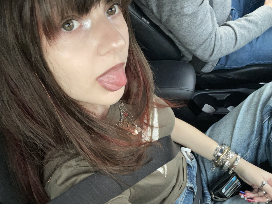 The image depicts a female individual inside a vehicle, likely a car, with a second individual partially visible. The primary subject is positioned centrally, viewed from a slightly elevated angle, with her head tilted counter-clockwise. She has long, dark brown hair with subtle reddish highlights and bangs. Her eyes are light brown, and white makeup or eyeliner is applied around the lower eyelids and inner corners. Her tongue is extended from her mouth. She is wearing an olive-green t-shirt with a horizontal lighter-colored stripe pattern across the chest, blue denim jeans, and a black seatbelt across her torso. Her left wrist displays numerous bracelets of varying metals and styles, and multiple rings are present on her left hand. Her fingernails are long and feature multi-colored polish or designs. Her left arm rests on her leg, near a small black pouch or bag. To her right, a second individual is partially visible, wearing a grey long-sleeved top and blue denim jeans, seated in what appears to be an adjacent car seat, which is black. The environment is the interior of a vehicle. The image does not contain visual information to specify the location as Hod HaSharon, Israel.