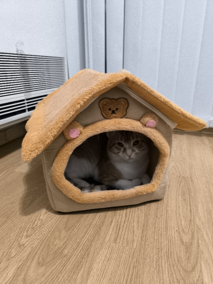 An indoor scene in Varna, Bulgaria, depicts a domestic shorthair cat resting inside a plush, house-shaped pet bed
