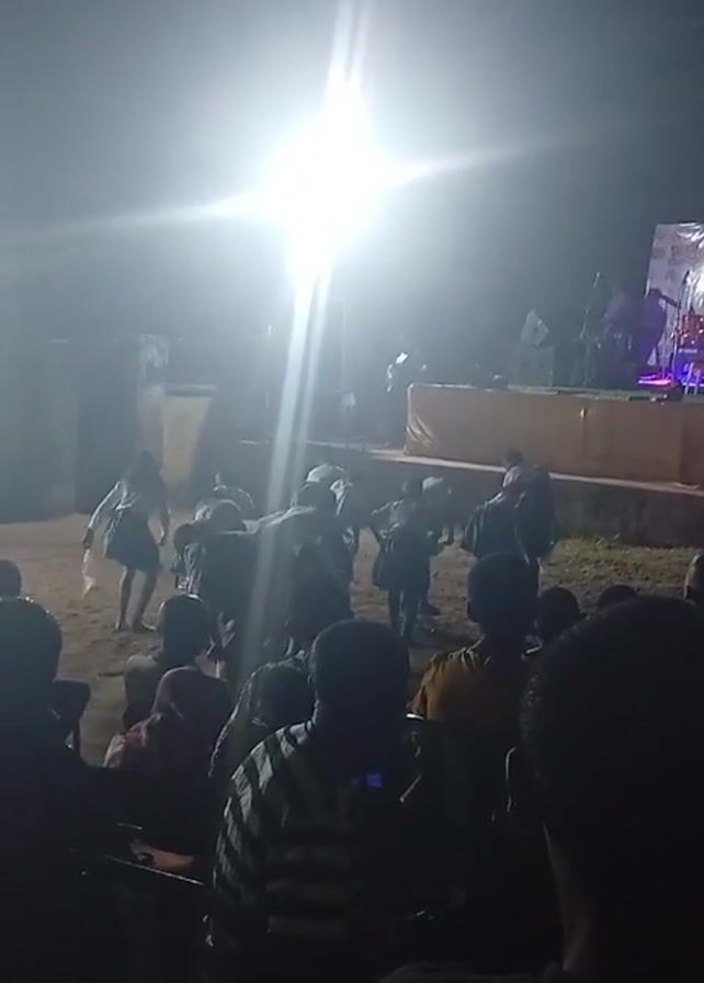 The scene is at night with a strong light source behind a stage. On the stage, several people are standing, possibly a band preparing to perform. In front of the stage, a group of young people are dancing energetically to music. They appear to be wearing school uniforms, possibly performing a traditional dance. A seated audience watches the performance. The setting seems to be an outdoor event.