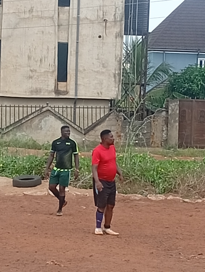 The image depicts an outdoor scene in Nkwelle Ezunaka, Nigeria, on a reddish-brown dirt ground. Two adult males are present. On the left, a male subject walks from left to right, wearing a black short-sleeved shirt with green accents, dark green shorts, dark socks, and dark-colored footwear. He appears to be looking forward or slightly right. To his immediate left, a black tire lies horizontally on the ground. On the right, a second male subject stands, facing right, dressed in a red short-sleeved shirt, dark shorts, blue socks, and light-colored athletic shoes. He has a slightly heavier build than the first individual. The background consists of several elements: To the left, a large, unpainted concrete building with multiple dark rectangular windows stands prominently. A dark metal fence runs across the middle ground, in front of this building and a small, peaked concrete structure. Behind the fence, lush green vegetation, including palm fronds, is visible. To the far right, a portion of a residential building with a dark, sloped roof and light blue walls is visible, adjacent to a weathered metal gate and dense green shrubbery.