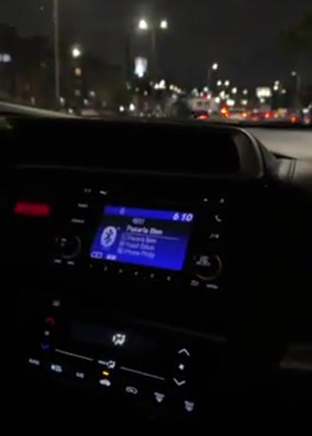 A car navigates a city street at night, with light posts illuminating the road and the city lights adding ambient light to the dark sky. The car's dashboard is visible, showing a digital display with music information and controls. In the foreground, the car's interior appears dark, with the dashboard buttons and controls visible. Outside, traffic moves along the street with headlights shining. The scene captures the feeling of a late-night drive through an urban environment.