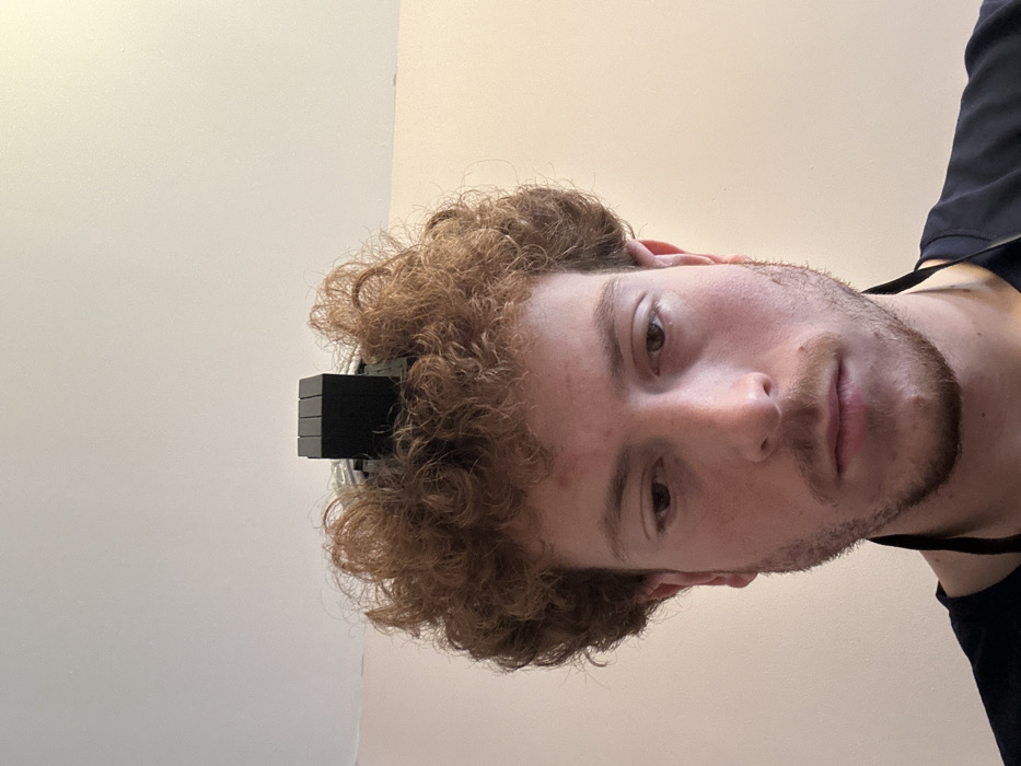 A headshot shows a fair-skinned man with curly reddish-brown hair. He has a beard, and his expression is neutral. Positioned atop his head is a small, stacked black object. He is seen from the chest up, turned slightly to the side. A black garment is visible on his right shoulder. The background is a plain beige wall. The image is slightly angled.