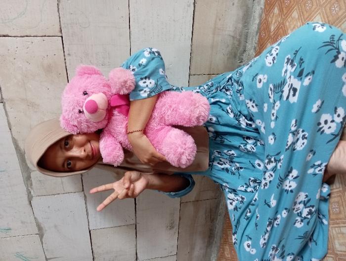 A female subject is depicted seated on a tiled floor against an unfinished concrete block wall in Baron, Indonesia. She is wearing a light beige hijab and a long, teal-colored dress adorned with white floral patterns. Her right hand is raised, forming a V-sign with the index and middle fingers. Her left arm cradles a pink plush teddy bear, which features a lighter pink snout, a dark nose, and a pink bow around its neck. A thin, reddish-orange bracelet is visible on her left wrist. The subject is looking directly at the viewer with a faint smile. The floor beneath her consists of light brown and white patterned tiles.