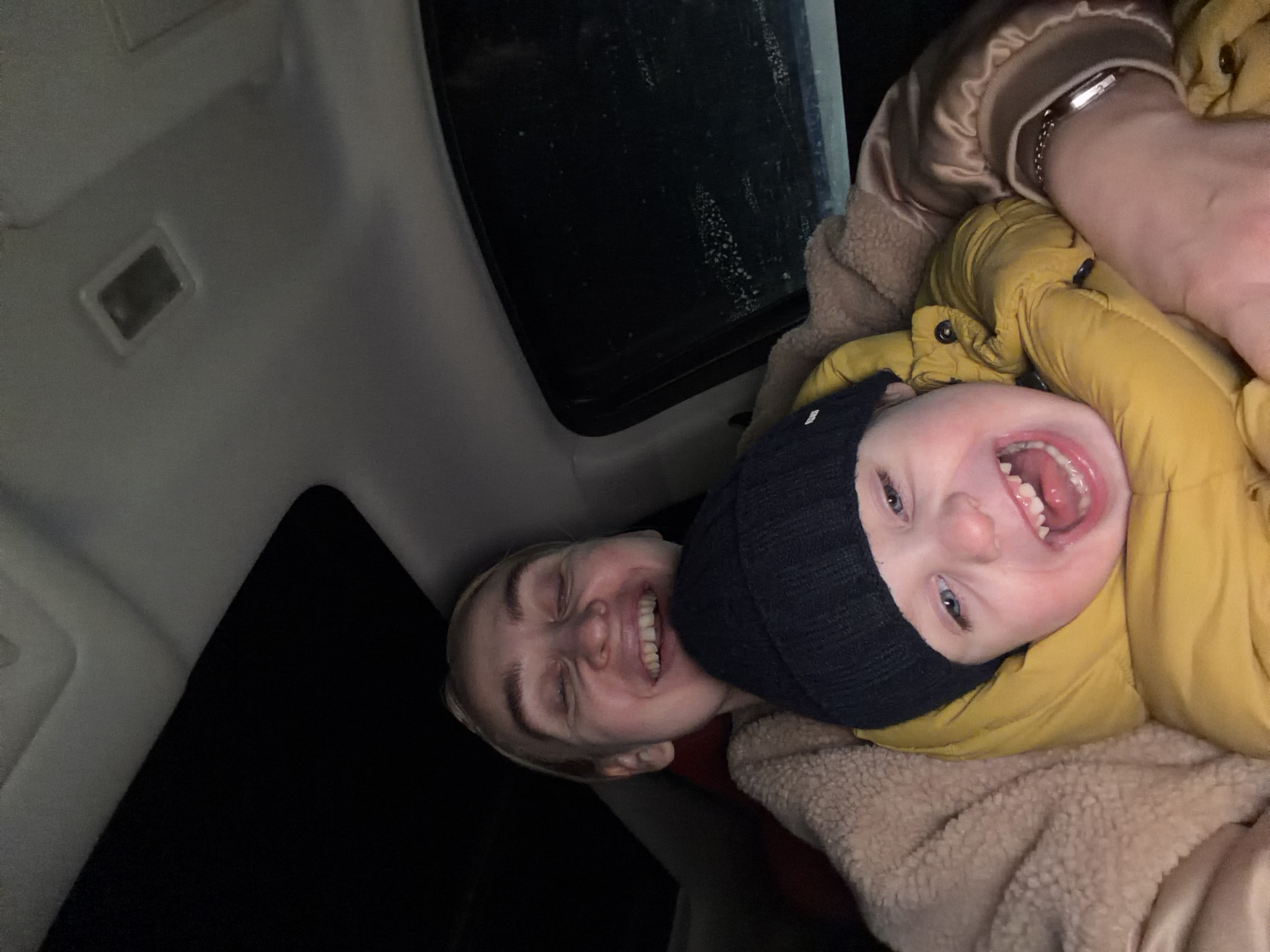 A slightly rotated, upward-angled medium shot shows a woman and a child in what appears to be the interior of a car, possibly in Chaikovsky, Russia. The woman is smiling and has fair skin, blonde hair and is facing left. The child is wearing a black beanie and yellow jacket, looking up and smiling. The interior of the car is visible; a car window is in the background.