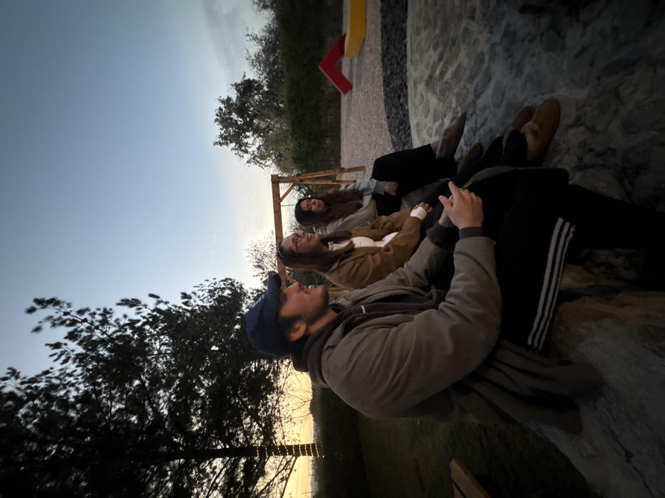 Three people sit side-by-side, seemingly outdoors. A man in a blue cap and grey jacket is in the foreground. Behind him, a woman with glasses wears a brown jacket. Further back, a woman in a light grey shirt is partially visible. Trees and a blue sky with a setting sun are visible above and behind them. A red and yellow structure is set back from the group. The group is sitting on a textured surface.