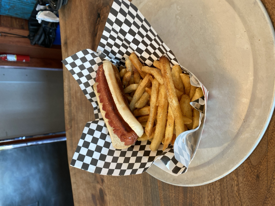 - "A hot dog and a generous portion of french fries are displayed in a paper boat container featuring a black and white checkerboard pattern on its rim, resting on a round, silver-colored metal tray" by FM-F9FdG3, licensed under CC BY 4.0