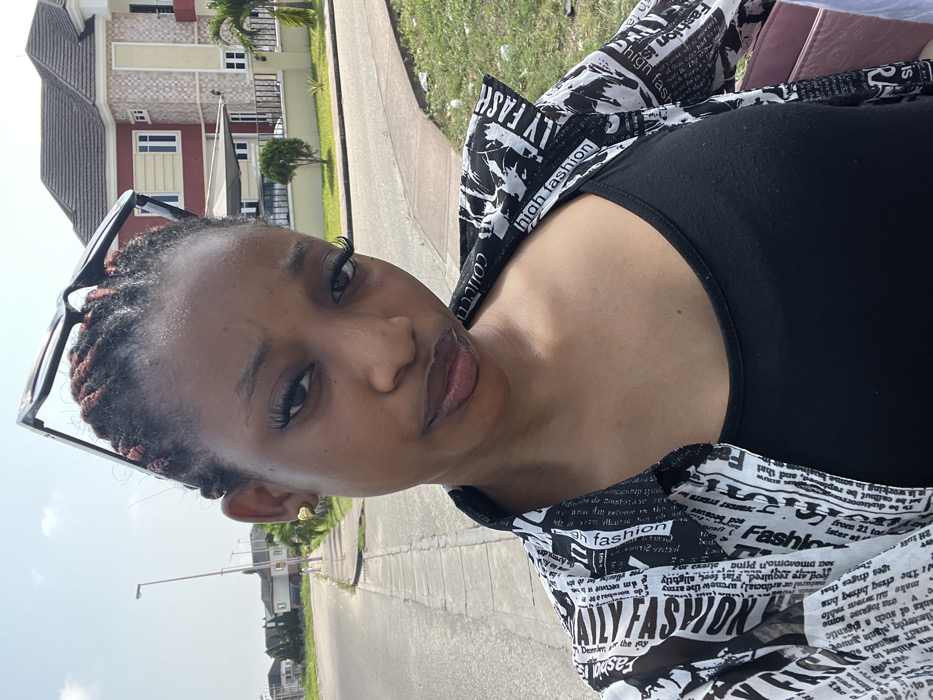 A young adult female with medium-dark skin, reddish-brown braided hair, and black-framed sunglasses perched on her head is depicted in a close-up outdoor portrait under bright daylight