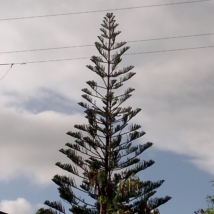 A tall, slender, conical evergreen tree with dark green foliage and tiered branches dominates the central and right portions of the frame. The tree extends vertically towards the upper edge. In the upper left quadrant, three parallel utility lines are visible against an overcast sky featuring scattered grey-white clouds and patches of light blue. An indistinct, dark mass is present at the bottom edge of the image. The scene is located in La Tagua, Venezuela.