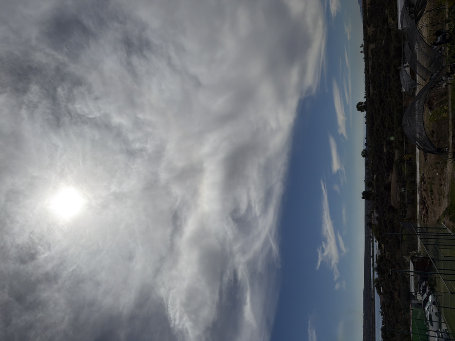 Sunlight pierces through wispy, layered clouds filling the sky, blending shades of white and grey. A narrow strip of blue sky extends to the horizon. The landscape below features dense trees and vegetation meeting a body of water in the distance. A wire fence and some spherical structures are visible in the immediate foreground, suggesting a controlled or cultivated area.