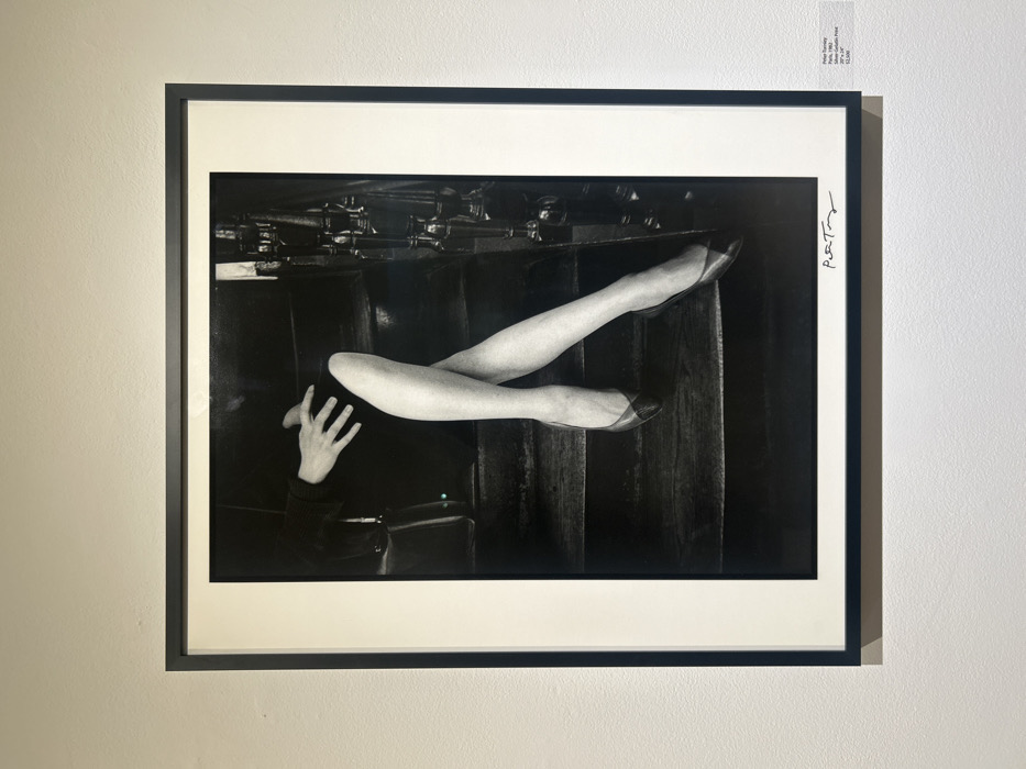 A framed black and white photograph hangs on a neutral wall. The photo depicts crossed legs in sheer stockings and ballet flats resting on stairs. A hand with visible fingers is visible on the left. The background shows dark interiors. The photograph is framed with a white matte and a dark frame. A small tag is visible in the top right corner. The artwork appears to be signed in the upper right corner of the photograph.