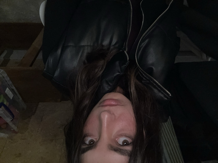 A person wearing a black leather jacket is photographed from an upside-down perspective. The person's face, with large eyes, is centrally framed. Brown hair frames the face, and a maroon top peeks from under the jacket. The background includes a wooden staircase and a storage bin on the left, along with what appears to be a dark upholstered piece of furniture on the right. The overall lighting is low, creating a slightly shadowy atmosphere.