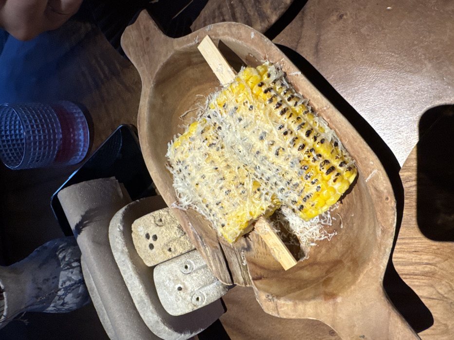 - "The image displays two halves of grilled corn on the cob, heavily coated with grated white cheese or a similar topping, each pierced with a small wooden skewer" by FM-pMfC42, licensed under CC BY 4.0