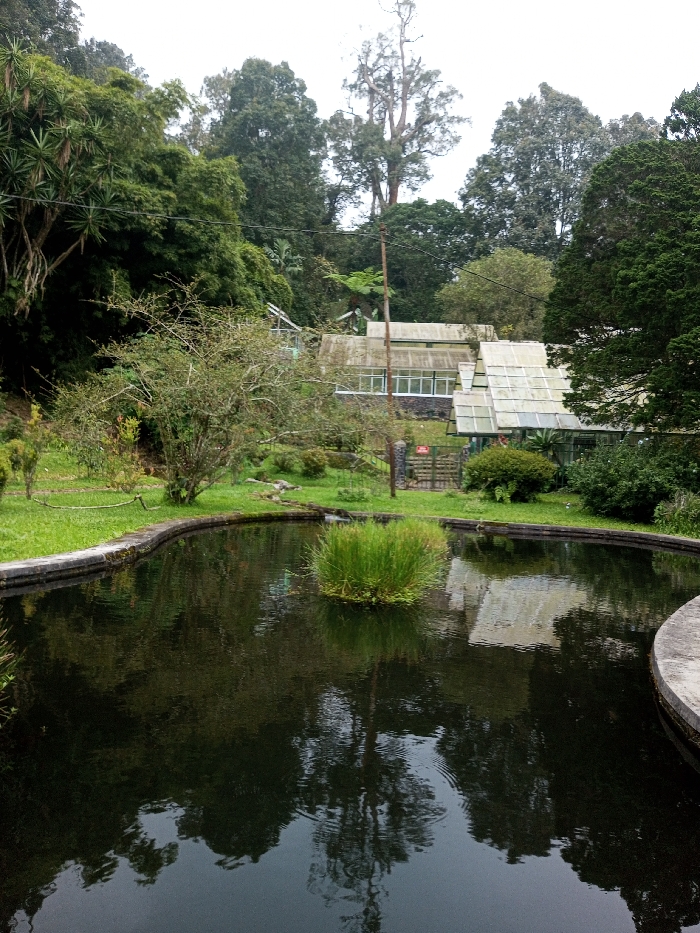 A tranquil scene unfolds with a dark, still pond reflecting the surrounding greenery and a greenhouse complex